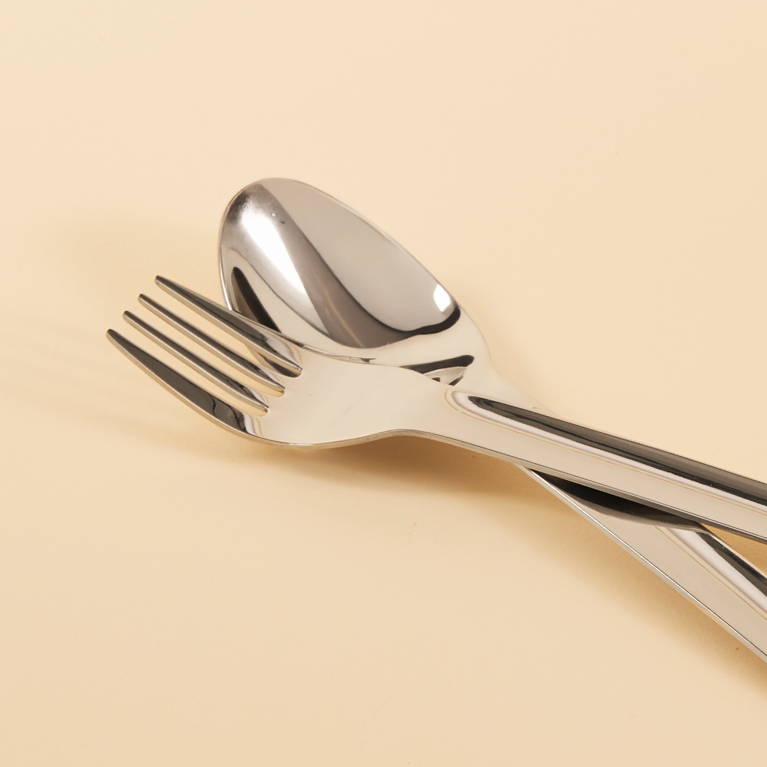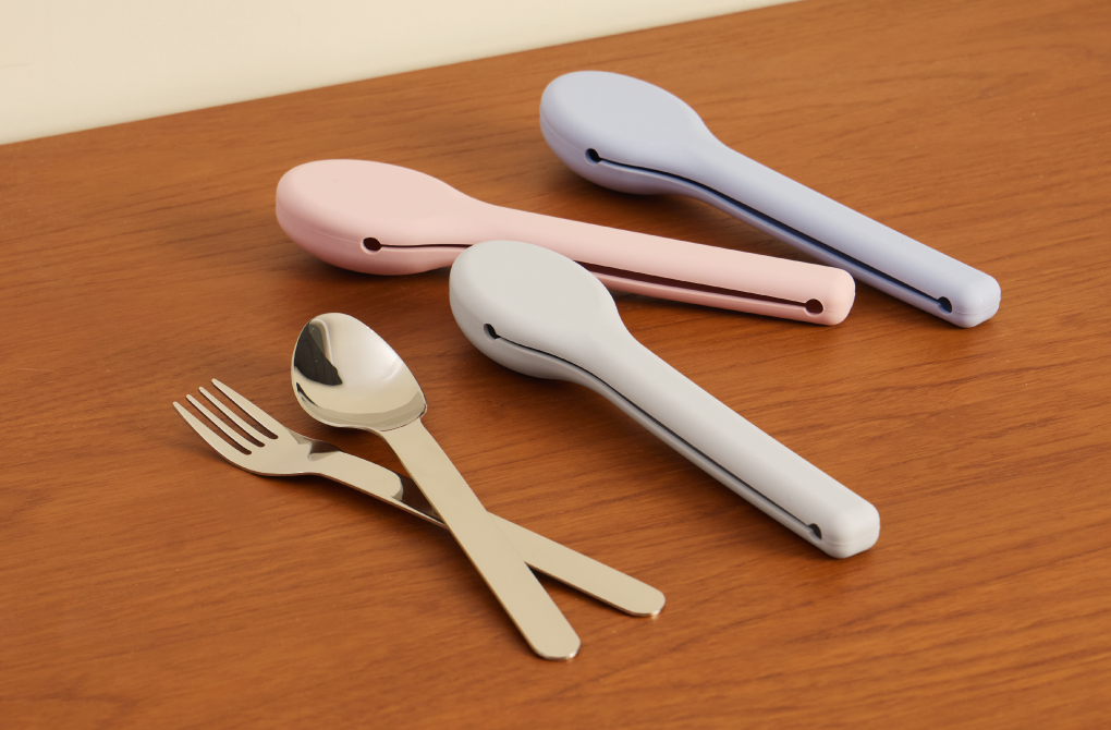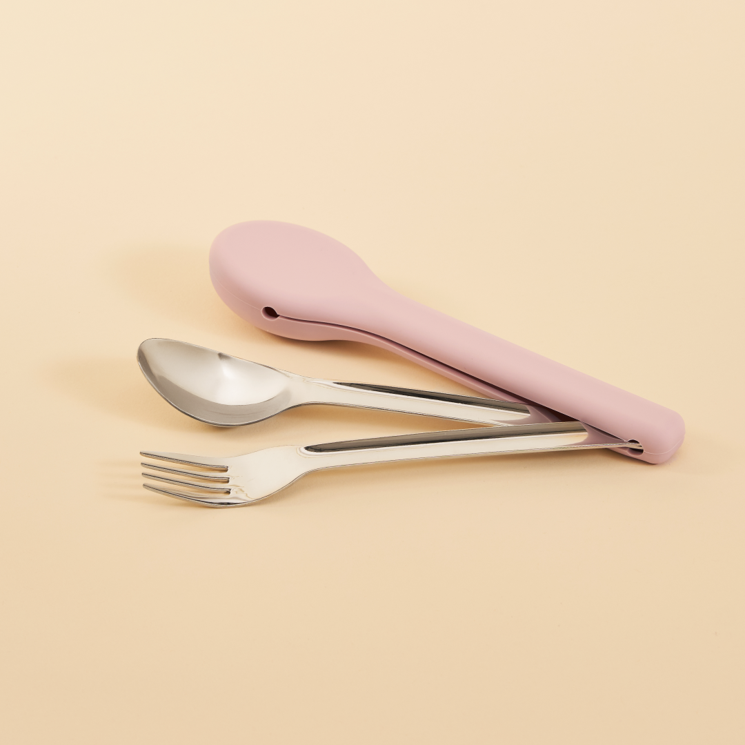 A sleek stainless steel cutlery set, with a soft, heat-resistant silicone cover—modern, compact, travel-friendly for meals on the go.